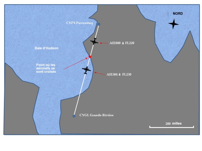 Le DHC-8-314 (portant l'immatriculation C-GUAI, numéro de série 423) exploité par Air Inuit ltée, sous l'indicatif de vol AIE880, effectue un vol selon les règles de vol aux instruments entre Puvirnituq et La Grande-Rivière (Québec) au niveau de vol 220. Un autre aéronef, aussi exploité par Air Inuit ltée, un DHC-8-102 (portant l'immatriculation C-FCJD, numéro de série 158), sous l'indicatif de vol AIE304, effectue la liaison inverse au niveau de vol 230, selon les règles de vol aux instruments. À environ 117 milles marins au sud de Puvirnituq, les 2 aéronefs reçoivent un avis de trafic, suivi d'un avis de résolution du système de surveillance du trafic et d'évitement des collisions. Des manœuvres d'évitement sont effectuées et les aéronefs se croisent avec un espacement d'environ 1500 pieds sur le plan vertical et 0,8 mille marin sur le plan horizontal. Ils poursuivent vers leur destination respective où ils se posent sans problème. L'événement se produit à 14 h 36, heure normale de l'Est, à la clarté du jour. Personne n'est blessé.