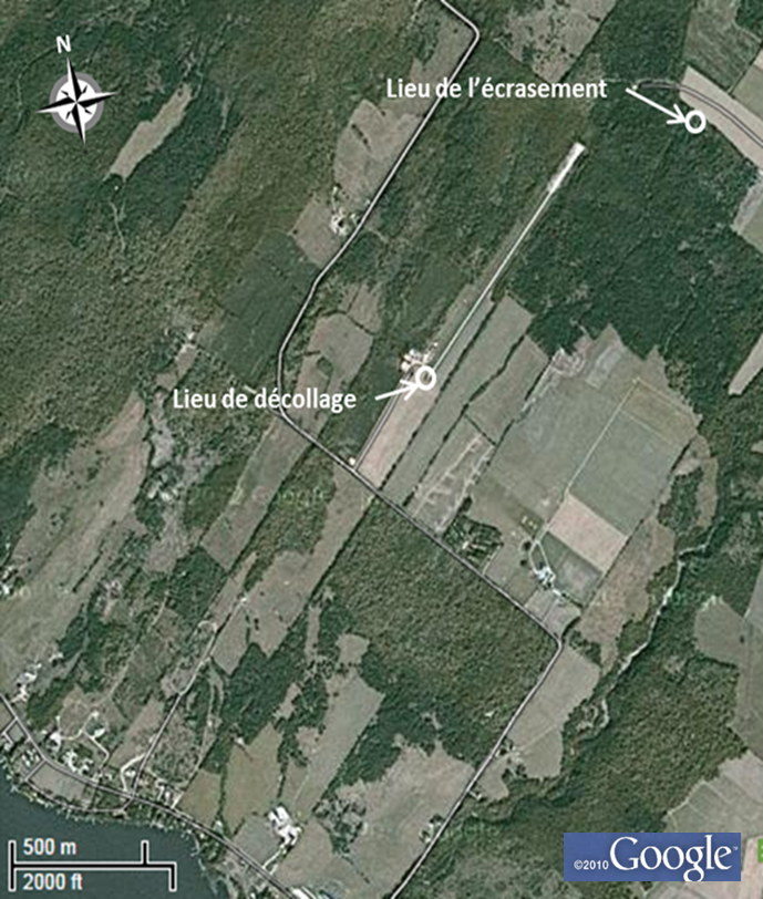 Plus tôt, le jour du vol en cause, le 27 août 2011, le pilote et 3 membres de sa famille ont décollé de la résidence du pilote située à Saint-Nicolas (Québec) pour rendre visite à des amis dans la région de Saint-Ferdinand (Québec). On ajoute 46 litres de carburant de type 100LL au réservoir principal pour le remplirNote de bas de page 1. Le point de départ se trouvant à l’intérieur de la zone de contrôle de l’aéroport international Jean-Lesage de Québec (CYQB), le pilote avait communiqué avec la tour vers 18 h 09Note de bas de page 2 avant de décoller, et obtenu les informations sur la direction et la vélocité du vent ainsi que le calage altimétrique. Aucun plan de vol n’avait été déposé auprès du Centre d’information de vol (FIC) de Québec; aucun itinéraire de vol n’avait été déposé auprès d’une personne responsable. L’appareil a décollé vers 18 h 13 et le pilote a immédiatement été autorisé en fréquence de route dès qu’il aurait quitté la zone de contrôle. L’appareil a poursuivi son vol à une altitude de 1500 pieds au-dessus du niveau de la mer (asl). À 18 h 38, l’appareil est disparu de l’écran radar alors qu’il se trouvait à 0,25 mille marin (nm) à l’est de l’aérodrome de Saint-Ferdinand et à une altitude de 1500 pieds aslNote de bas de page 3. L’appareil s’est posé sans problème dans le champ au sud du seuil de la piste 05. Il y est demeuré stationné jusqu’à son départ.