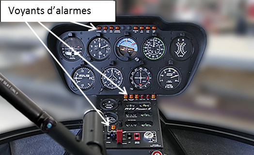 Le R44 Raven II est doté de 15 voyants d’alarmes ayant pour fonction d’alerter le pilote de conditions qui requièrent son attention. Huit de ces voyants sont localisés sur le haut du tableau de bord et 7 se trouvent sur le panneau central (photo 1)Note de bas de page 19.