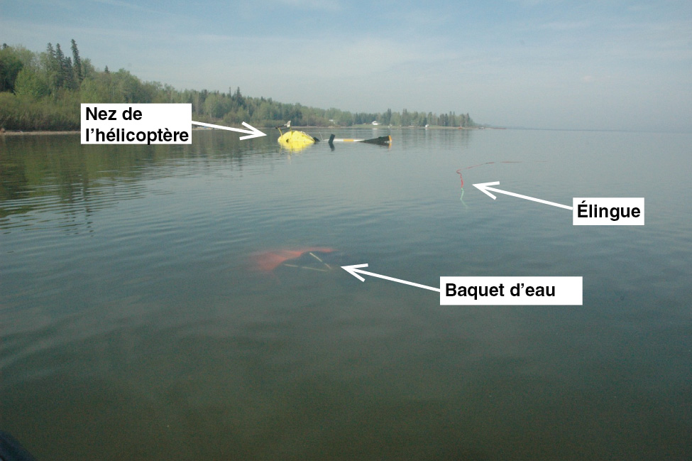 - L'hélicoptère a subi une violente traction vers l'arrière et la gauche après que le baquet héliporté s'est enfoncé dans l'eau. L'aéronef a par la suite perdu de l'altitude et, conséquemment, le pilote a perdu le contrôle de l'hélicoptère.