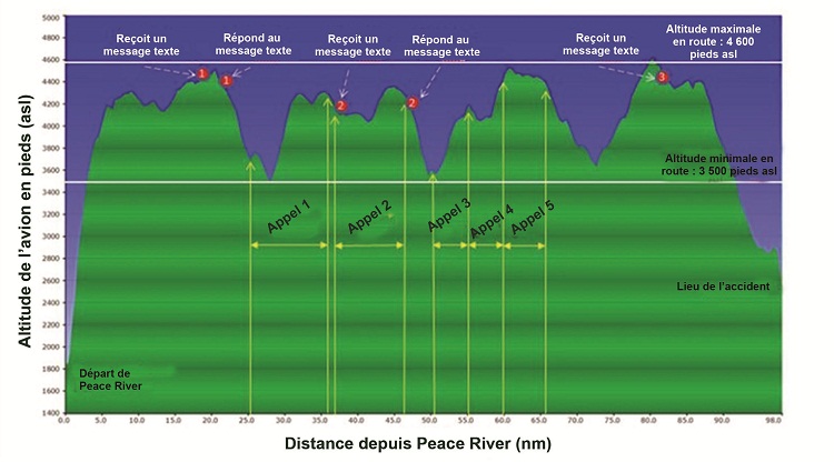 Pendant l'escale au sol à l'aéroport de Peace River, le pilote a avisé le centre d'information de vol (FIC) d'Edmonton qu'il révisait à 18 h 13 son heure d'arrivée prévue à l'aéroport de Fort St. John. Le pilote a ensuite décollé à 17 h 06 en signalant son déplacement vers l'ouest à 4500 pieds au–dessus du niveau de la mer (asl). Entre 17 h 19 et 17 h 55, le pilote a échangé 2 messages texte et a fait 5 appels téléphoniques avec son cellulaire totalisant 28 minutesNote de bas de page 3. Le pilote a reçu un dernier message texte à 18 h 06, 11 minutes avant l'accident (voir l'annexe A).