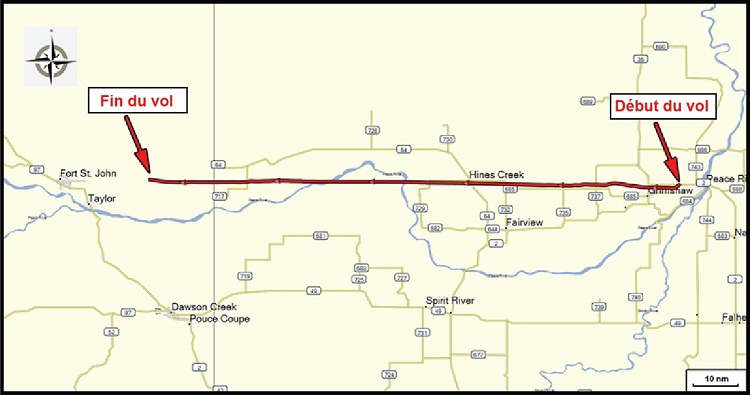 Le pilote a décollé de l'aéroport de Fort St. John à 8 h 43Note de bas de page 1 à destination de l'aéroport de Peace River (Alberta), où il s'est posé à 9 h 40. Un seul passager est monté à bord, et l'avion a quitté Peace River à 10 h 43, cette fois à destination de Fort Vermilion, en Alberta. L'avion a été avitaillé en carburant à Fort Vermilion, puis a repris son envol à 13 h 59 pour suivre le cours de la rivière de la Paix jusqu'à Vermilion Chutes avant de retourner à l'aéroport de Peace River pour y déposer le passager. Avant de rejoindre l'aéroport de Peace River, le pilote était en communication, par téléphone cellulaire, avec le directeur de l'exploitation de l'entreprise pour le tenir au courant de la progression du vol. Le pilote était conscient de la nécessité d'être de retour à Fort St. John avant la nuitNote de bas de page 2.