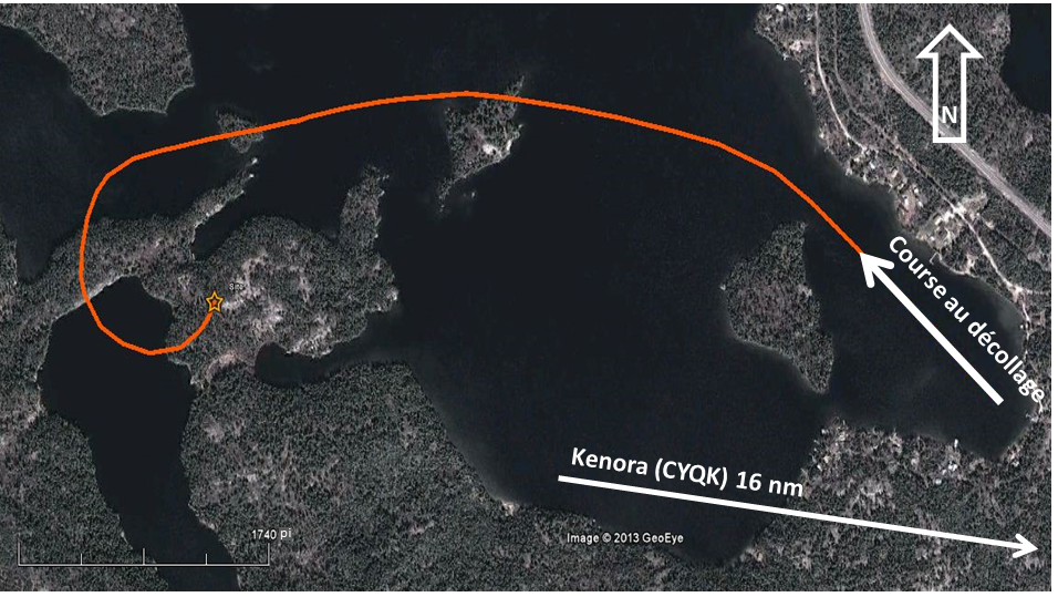 Après le démarrage du moteur, le pilote a circulé sur l'eau en vent arrière, a fait le point fixe, puis a décollé environ 6 minutes plus tard. L'aéronef a fonctionné normalement durant le décollage et a atteint un taux de montée positif. Peu après le décollage, les volets ont été rentrés. La vitesse indiquée était d'environ 90 à 100 milles à l'heure (mi/h) durant la montée. Le pilote a amorcé un virage à gauche, vers l'ouest, pour demeurer au-dessus de l'eau. Le pilote a ensuite volé en palier, cap vers l'ouest, puis l'aéronef a grimpé à environ 400 pieds au-dessus du niveau du sol (agl). Il y a eu un bruit inhabituel, et l'aéronef a effectué un roulis intempestif et un virage à gauche à un angle d'inclinaison prononcé. Les commandes de vol ont cessé de répondre et le pilote a perdu la maîtrise de l'aéronef. Le klaxon de l'avertisseur de décrochage a retenti à plusieurs reprises lorsque l'aéronef a amorcé sa descente. Le pilote a modifié les réglages de puissance moteur à plusieurs reprises tout en essayant de reprendre la maîtrise de l'aéronef. Celui-ci a fait un mouvement de lacet, puis un roulis vers la gauche, ce qui a entraîné un changement de cap d'environ 240° (figure 1). L'aéronef a percuté le relief ascendant et boisé entre 2 lacs alors qu'il suivait un cap d'environ 025° magnétique (M). L'aéronef s'est immobilisé sur son flanc gauche devant un mur de granit de 10 pieds de haut.