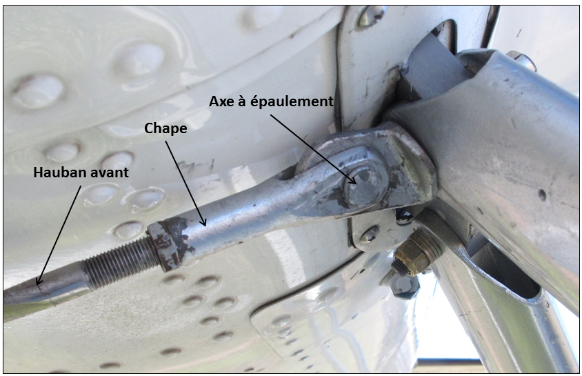 - Pour des raisons qui n'ont pu être déterminées, un axe à épaulement qui fixait un hauban avant à l'adaptateur du train d'atterrissage de gauche n'était pas retenu en place par une clavette. Ainsi, peu après le décollage, l'axe à épaulement a probablement glissé de la chape, et le hauban avant s'est détaché.