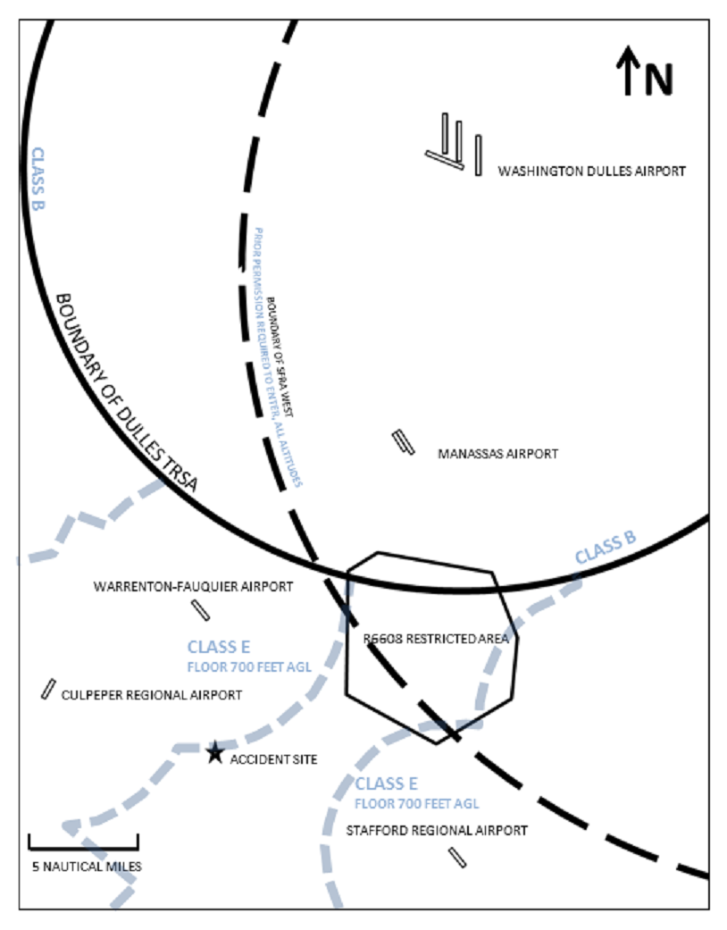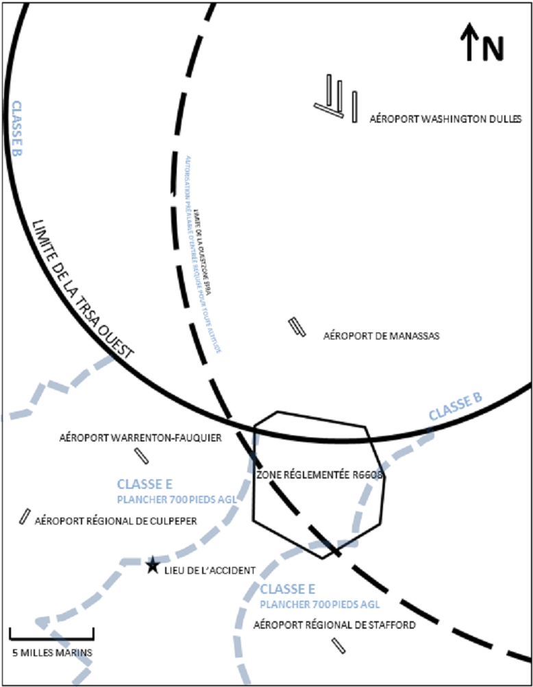 Le pilote du Beechcraft V35B Bonanza (le « Beechcraft ») arrive à l'aéroport Warrenton-Fauquier (KHWY) à 15 h 15Note de bas de page 1 pour prendre à son bord un instructeur afin de procéder à une révision en vol.Note de bas de page 2 Avec l'instructeur de vol accrédité à bord, le Beechcraft amorce son vol à 15 h 45 en direction du sud et monte à 3000 pieds au-dessus du niveau de la mer (ASL). Aucun service de circulation aérienne n'est demandé par les pilotes du Beechcraft, ni n'est requis dans l'espace aérien dans lequel volait l'avion. Les données radar enregistrées indiquent que le Beechcraft transmet sur code de transpondeur 1200.Note de bas de page 3