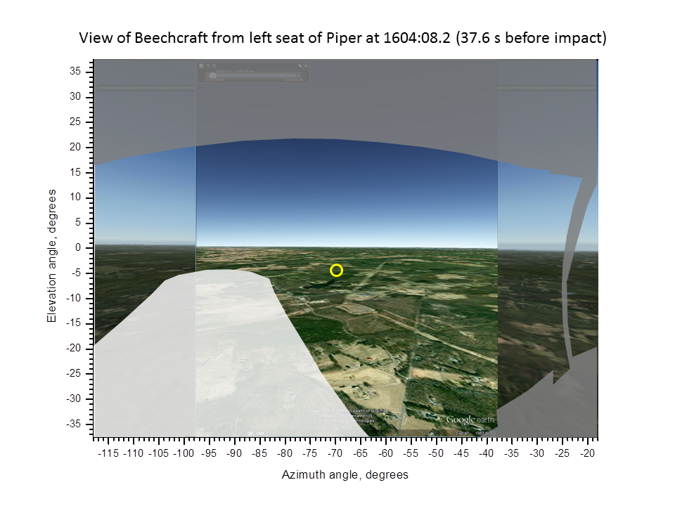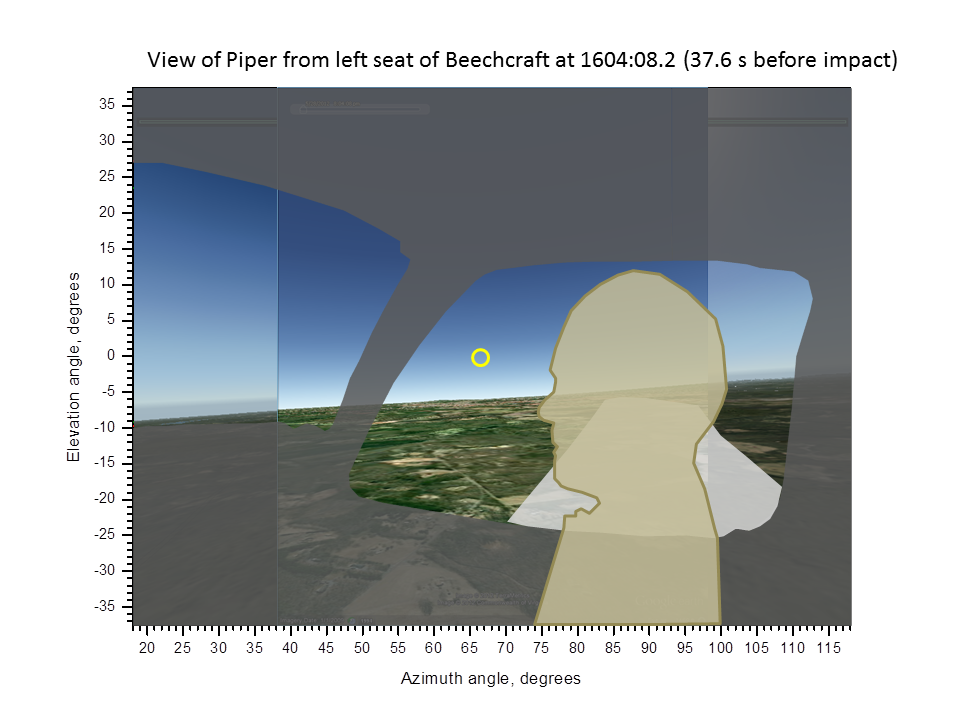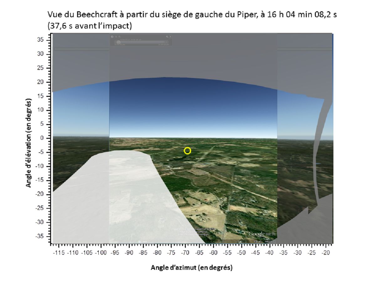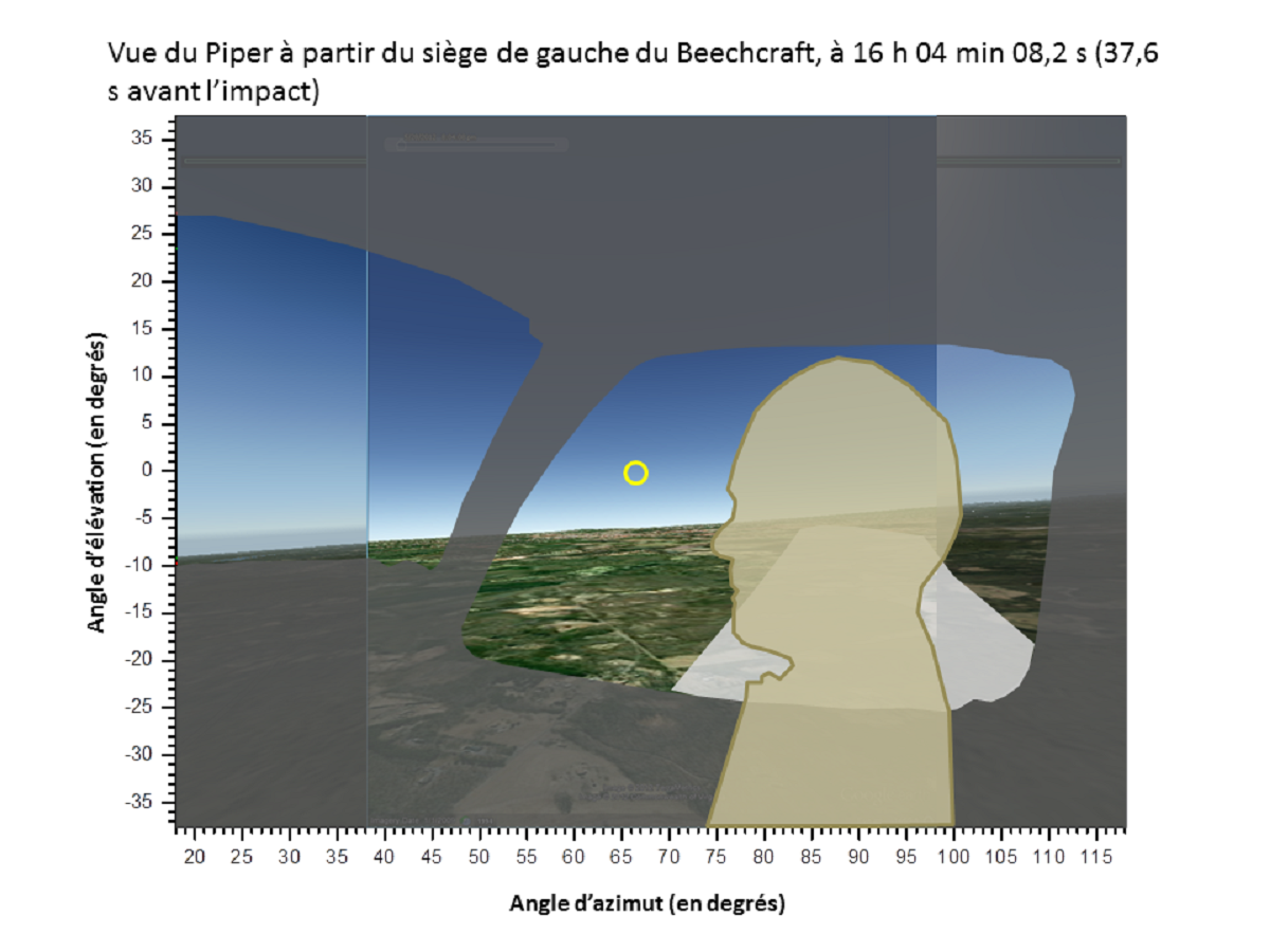 Le Piper et le Beechcraft sont entrés en collision sur une trajectoire convergente de 45° depuis le côté gauche du Piper. Le train d'atterrissage du Beechcraft était rentré et les volets étaient réglés à 15°. L'analyse des champs de vision a révélé qu'il est très probable que les aéronefs étaient visibles l'un à l'autre, c'est-à-dire que leur structure n'aurait pas entravé la visibilité de l'aéronef qui approchait (Annexe C – Champs de vision approximatifs). Le champ de vision du pilote du Beechcraft a pu être bloqué par la tête de l'instructeur, selon la position des sièges et la posture de chacun, mais le champ de vision de l'instructeur aurait été libre. Rien n'indique que l'un ou l'autre des aéronefs aurait tenté une manœuvre pour éviter la collision.