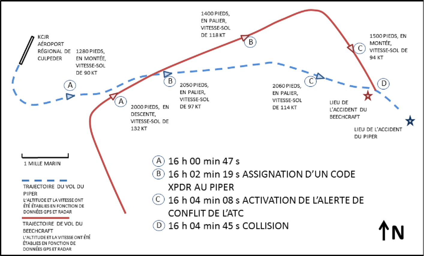À 15 h 55, le Beechcraft, qui vole en direction nord, se trouve à 13 milles marins (nm) au sud de l'aéroport régional Culpeper (KCJR), à 3000 pieds ASL. À ce moment, le Piper PA-28-140 (le « Piper ») s'envole de l'aéroport KCJR selon les règles de vol à vue (mode VFR) et monte en se dirigeant vers l'est. À 16 h, le Beechcraft amorce une descente (figure 1). Pendant la descente du Beechcraft, le point de rapprochement maximal des 2 aéronefs est de 600 pieds verticalement et de 0,9 nm latéralement. On n'a pas pu établir si l'un des pilotes a vu l'autre avion ou si les 2 avions étaient sur la même fréquence radio.