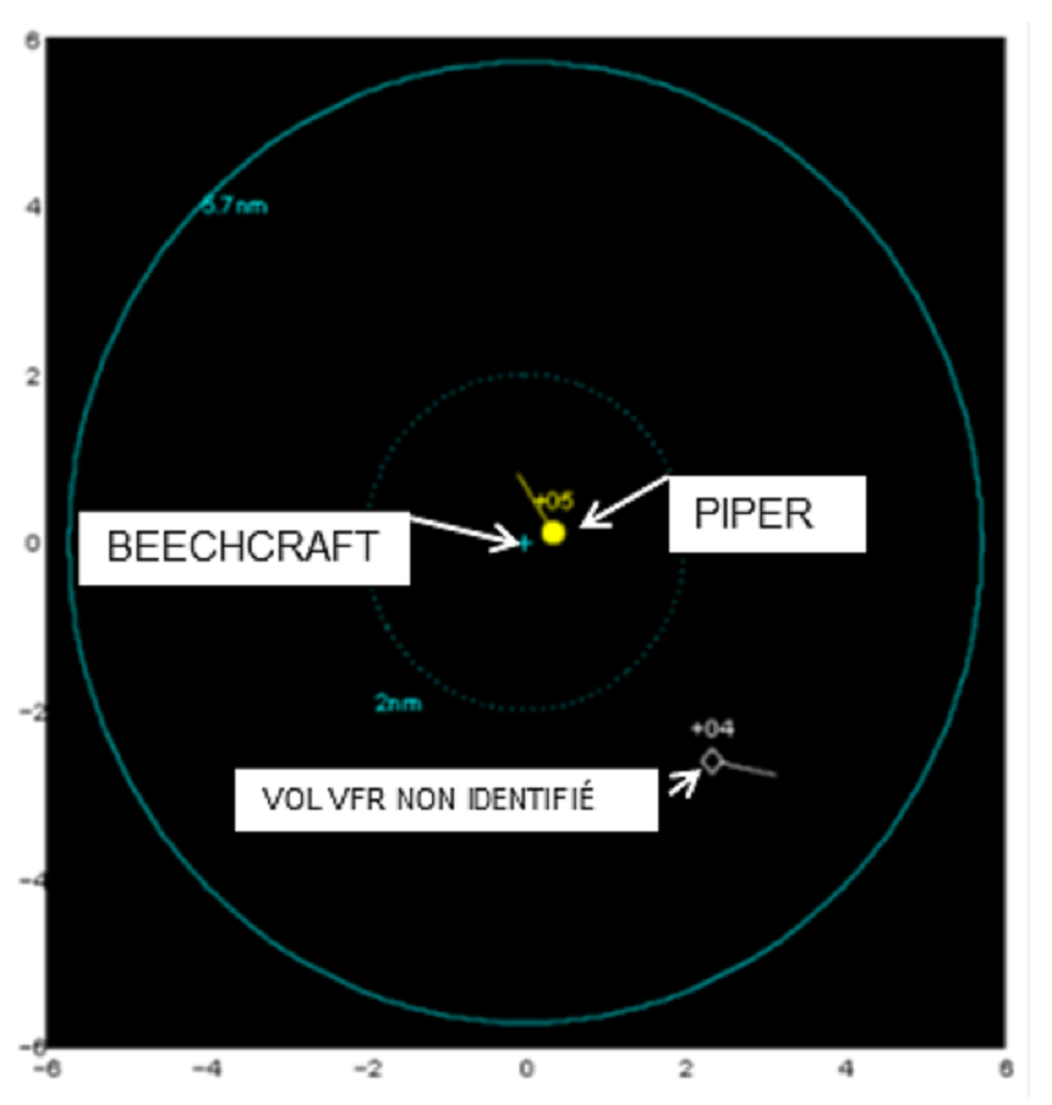 À 16 h 04 min 08 s, une alerte de conflit sonore retentit et une alerte visuelle s'affiche au poste du contrôleur. Le contrôleur de relève entend et voit l'alerte; le contrôleur relevé, ayant quitté son poste, n'a ni entendu ni vu l'alerte. L'alerte de conflit sonore prend fin après environ 5 secondes, mais l'alerte visuelleNote de bas de page 6 demeure affichée. Au moment où l'alerte de conflit retentit, à 16 h 04 min 08 s, le Beechcraft a amorcé une lente montée en direction sud sur une trajectoire qui converge avec celle du Piper. Le Beechcraft se trouve à environ 500 pieds au-dessous du Piper et à 0,9 nm à l'est de celui-ci. Le contrôleur constate l'espacement vertical, établit qu'il n'y a pas de conflit et retourne pour s'assurer que l'espacement sera maintenu entre les 2 aéronefs volant en mode IFR, au nord, sur des routes sécantes. Pendant les 44 secondes qui s'écoulent entre 16 h 04 min 10 s et 16 h 04 min 54 s, le contrôleur communique avec plusieurs aéronefs volant en mode IFR dont la responsabilité lui incombe. Le contrôleur transmet plusieurs instructions au pilote de l'un des 2 aéronefs volant en mode IFR suivant des routes sécantes, dont une demande de mise en palier dans 2 milles et de changement de fréquence. La dernière confirmation de cet avion commence à 16 h 04 min 35 s. À 16 h 04 min 38 s, le contrôleur demande un changement de fréquence à un troisième aéronef volant en mode IFR et reçoit une confirmation à 16 h 04 min 40 s. À 16 h 04 min 43 s, le pilote d'un autre avion (quatrième aéronef volant en mode IFR) syntonise la fréquence. Le contrôleur assigne une altitude, avise le pilote qu'il sera le troisième à atterrir à sa destination et reçoit une confirmation à 16 h 04 min 50 s. Il n'y a aucune alerte de conflit associée aux avions précédents.