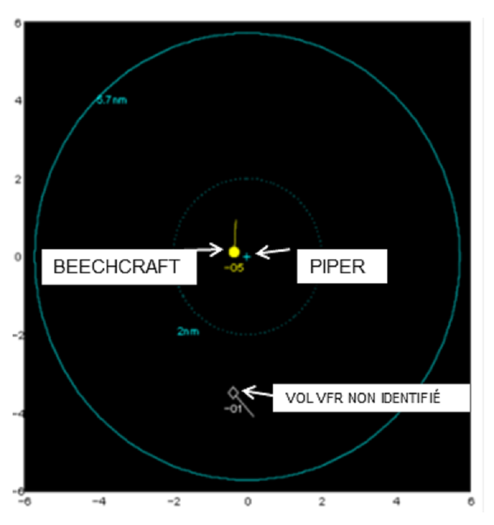 Un système de ce type, le service d'information sur le trafic (TIS), a été examiné afin d'établir si une alerte aurait pu être déclenchée en temps opportun, si l'un des avions en avait été équipé. La figure 2 et la figure 3 représentent des écrans d'une simulation du NTSB de messages d'un TIS qui auraient pu être envoyés au Piper et au Beechcraft s'ils avaient été équipés de l'équipement avionique requis pour recevoir et afficher ces messages.