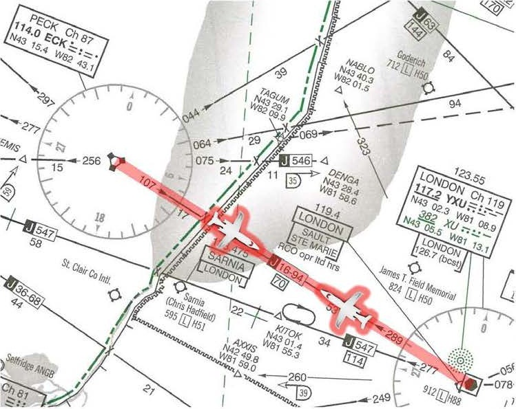 | 13 h 42 40 s | Le contrôleur radar d'Oakville demande à l'équipage de l'appareil N128GV d'entreprendre une montée. L'équipage de l'appareil N128GV confirme avoir reçu l'instruction et informe le contrôleur qu'il répondait déjà à un RA du TCAS. Les aéronefs sont maintenant à moins de 3 nm l'un de l'autre. |