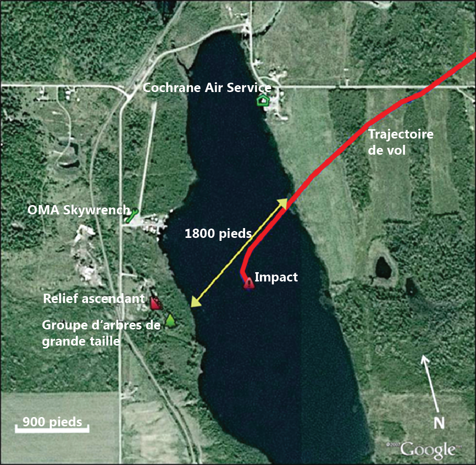 À cet endroit, le lac offre, en direction sud-ouest, une distance d'environ 1800 pieds pour effectuer un amerrissage. La rive ouest, du côté face au vent de la trajectoire d'amerrissage prévue, était en pente et bordée de grands arbres regroupés de façon irrégulière (figure 1). Lorsque l'aéronef s'est approché de cette zone d'amerrissage, il y a eu de fortes rafales. L'aéronef est entré dans l'arrondi à un endroit approprié pour la distance d'amerrissage disponible, mais, en raison des rafales, le pilote n'a pas réussi à poser l'aéronef sur l'eau. Alors que l'aéronef se trouvait approximativement à mi-chemin au-dessus du lac, le pilote a décidé d'interrompre l'amerrissage et de remettre les gaz. Le pilote a ainsi appliqué la pleine puissance et l'aéronef s'est cabré. Dans les quelques secondes qui ont suivi la remise des gaz, l'aéronef s'est incliné rapidement vers la gauche et a frappé l'eau de son aile gauche, selon une assiette partiellement inversée, immédiatement suivie du poste de pilotage et de l'aile droite. Le fuselage de l'aéronef a rapidement été submergé. L'aéronef s'est immobilisé à l'envers sur le fond vaseux du lac, partiellement suspendu par les flotteurs, qui étaient toujours en bon état.