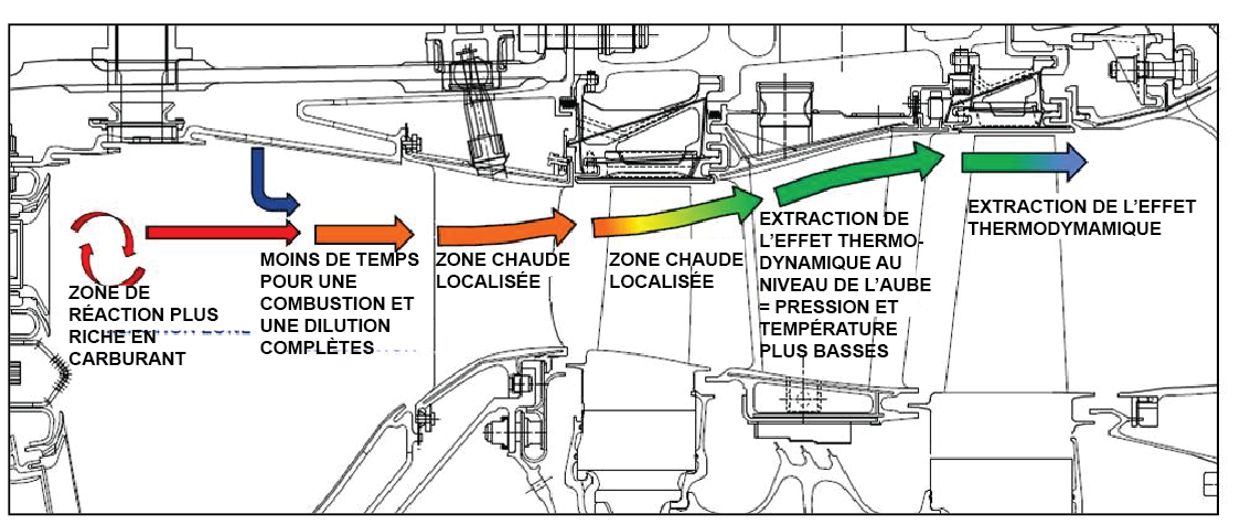 Le phénomène est le plus susceptible de survenir dans l'étage 1 de la turbine HP, où les températures sont plus élevées qu'en tout autre endroit du moteur. Pendant que le gaz s'écoule vers l'arrière, les différents étages de la turbine en extraient l'énergie. Les températures sont alors relativement plus basses, ce qui réduit la possibilité de la formation d'une zone surchauffée plus loin derrière l'étage 1 de la turbine HP. Il a été établi que la condition à l'origine de la détérioration de la couronne était liée à l'opération de perçage au laser des orifices de refroidissement dans la couronne. La détérioration subséquente de la couronne a réduit l'efficacité du refroidissement de cette dernière et augmenté le taux de perte de matière.