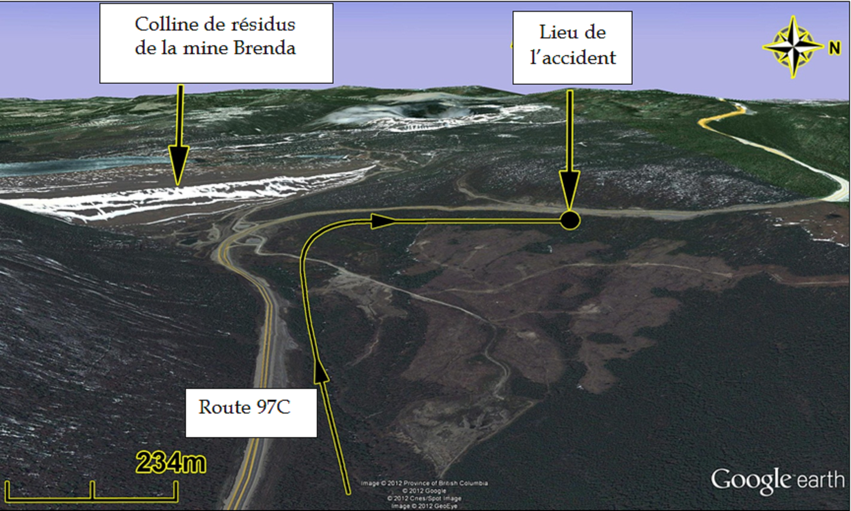 La route 97C suit une pente ascendante abrupte vers l'ouest en sortant de la vallée de l'Okanagan. Il y a alors un virage à droite (direction nord) au pied de la colline de résidus de la mine Brenda, puis la route continue de grimper suivant une pente abrupte (figure 1).