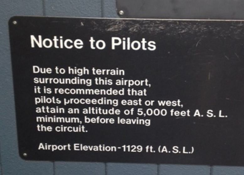 À l'aéroport de Penticton (30 nm de Kelowna et à l'extrémité sud du lac Okanagan), un panneau situé sur le mur côté piste, près de la porte du kiosque d'information destinée aux pilotes, prévient les pilotes des risques liés à l'élévation du relief dans la région et souligne l'importance d'atteindre 5000 pieds asl avant de quitter le circuit (photo 2).