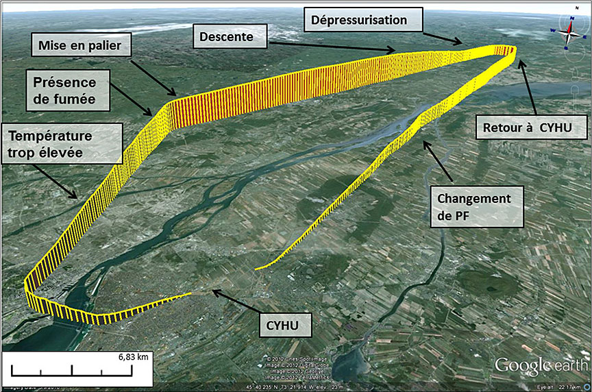 À 9 h 20, l'équipage a mis l'appareil en palier à 17 000 pieds asl, à environ 35 nm de l'aéroport CYHU et à 35 nm de l'aéroport de Trois-Rivières (CYRQ) (Québec). Comme la cabine de l'aéronef était pressurisée, l'équipage a demandé l'autorisation de descendre. À 9000 pieds asl, l'équipage a réglé les 2 interrupteurs de vanne de prélèvement d'air à la position ENVIR OFFNote de bas de page 2 et la fumée a alors commencé à se dissiper.