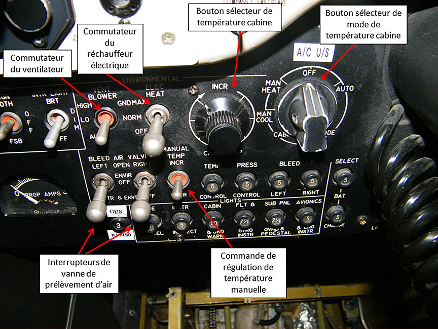 Un tableau de commande du système de ventilation, situé du côté du copilote dans le poste de pilotage, permet la régulation automatique ou manuelle (photo 2). Le tableau comprend le commutateur du ventilateur (VENT BLOWER), le commutateur du réchauffeur électrique (ELEC HEAT), le bouton sélecteur de température cabine (CABIN TEMP), le bouton sélecteur de mode de température cabine (CABIN TEMP MODE), les 2 interrupteurs de vanne de prélèvement d'air (BLEED AIR VALVE) et la commande de régulation de température manuelle (MANUAL TEMP).