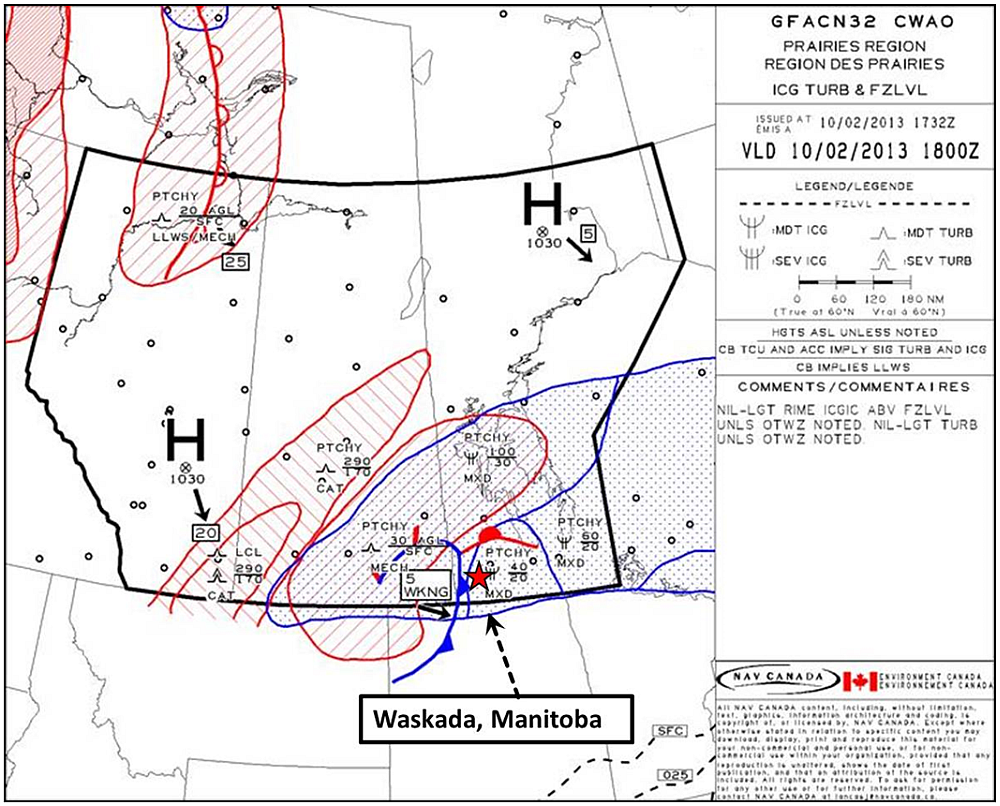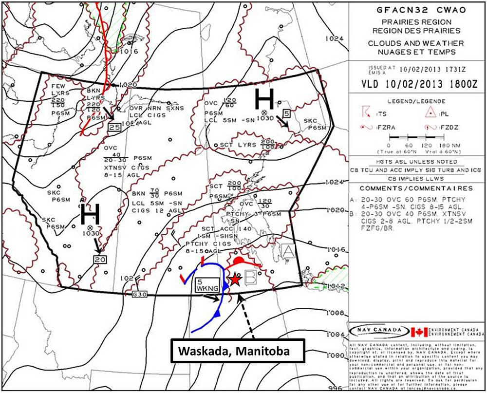 Le message d'observation météorologique régulière pour l'aviation (METAR) de 12 h pour Brandon, situé à environ 63 milles marins (nm) au nord-est de la bande d'atterrissage privée, indiquait : vent de surface soufflant du 050° à 11 nœuds, visibilité au sol variant de ¾ à 1 mille terrestre (sm) dans de la légère neige et de la brume, avec des nuages épars à 600 pieds au-dessus du sol (agl). La carte de prévision de zone graphique (GFACN32) Nuages et temps, ainsi que la carte Givrage, turbulence et niveau de congélation en vigueur à partir de 12 h, le 10 février 2013, indiquaient un ciel couvert avec la base des nuages à 2000 à 3000 pieds au-dessus du niveau de la mer (asl) et un sommet à 6000 pieds asl dans la région de Brandon et de Waskada (annexe A et annexe B). On prévoyait une visibilité variant de 4 sm à plus de 6 sm dans de la neige légère avec visibilité supérieure à 6 sm par endroits. On prévoyait aussi des plafonds dans le secteur variant de 600 à 1200 pieds agl, avec une visibilité locale de 1 sm dans la faible bruine verglaçante et la brume, et un plafond à 300 pieds agl.