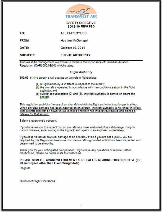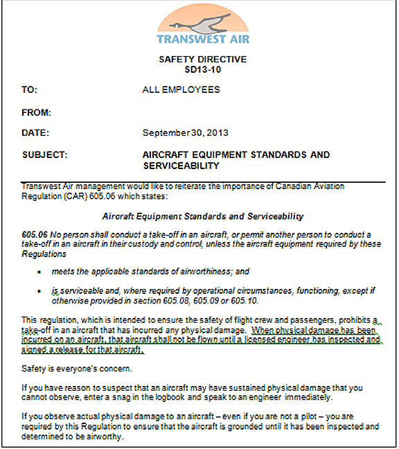 Le 30 septembre 2013, Transwest Air a publié la directive de sécurité SD13-10 (Annexe A), qu'elle a distribuée à tous ses employés. Cette directive réitère l'attente de l'entreprise relativement à la conformité à l'article 605.06 du Règlement de l'aviation canadien (RAC).