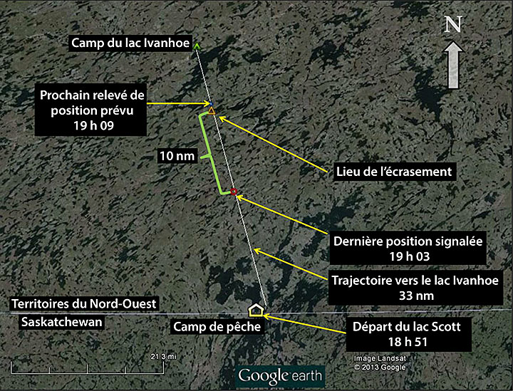 La radiobalise de localisation d'urgence (ELT) de l'aéronef n'a émis aucun signal. Le C-130 Hercules dépêché par le JRCC a entrepris un circuit de recherches aériennes en direction du lac Ivanhoe à partir de la dernière position signalée. On a découvert l'épave le 23 août 2013 à 5 h 26 sur une trajectoire entre le lac Scott et le lac Ivanhoe, à 10 milles marins (nm) au nord du dernier compte rendu de position indiqué dans les données transmises à 19 h 3 (Figure 1).