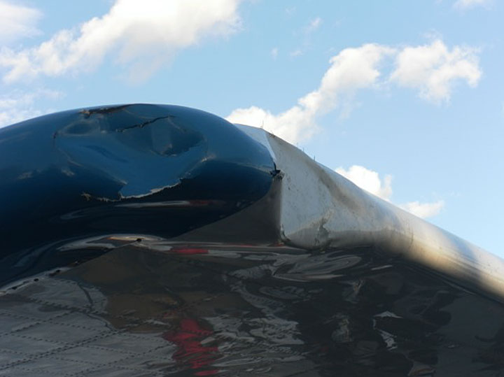 - Durant l'approche d'amerrissage du vol précédent, le bord d'attaque et le saumon d'aile de l'aile droite ont été endommagés par un impact avec plusieurs arbres.