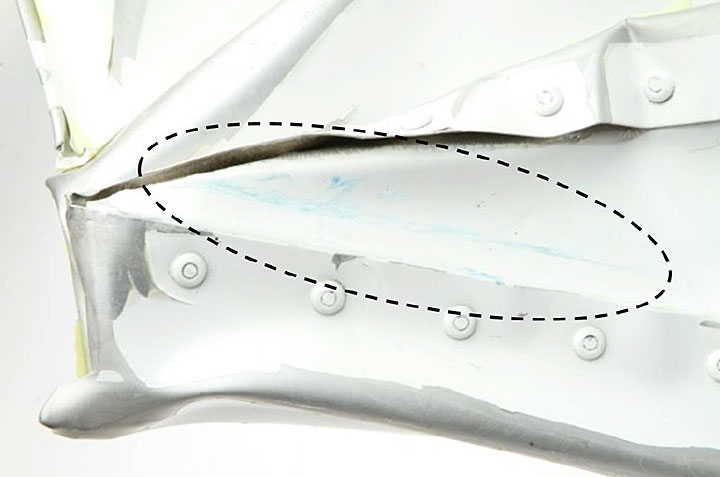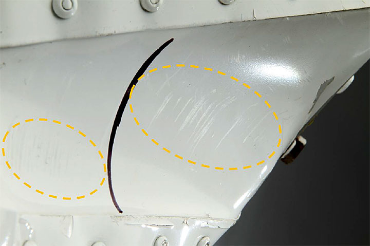 La nervure extérieure de l'aileron de l'aile droite affichait une bosselure dans le sens de la corde (Photo 3) ainsi que des traces de peinture bleue et des éraflures en forme d'arc sur la peinture à partir du point d'articulation (Photo 4). On a également noté des marques de peinture bleue du saumon d'aile sur la partie avant du volet attenant, la fixation de l'articulation et le revêtement d'extrados de l'aileron. L'aileron et les composants du volet de l'aile gauche ne présentaient aucune marque de peinture. L'épave a été rapportée sur la rive avant d'être transportée à Stony Rapids. Les enquêteurs du BST ont examiné l'épave sur les lieux de l'accident et à Stony Rapids, de même qu'à son site d'entreposage définitif à Prince Albert (Saskatchewan). Certains éléments ont été envoyés au Laboratoire du BST aux fins d'examens plus approfondis.