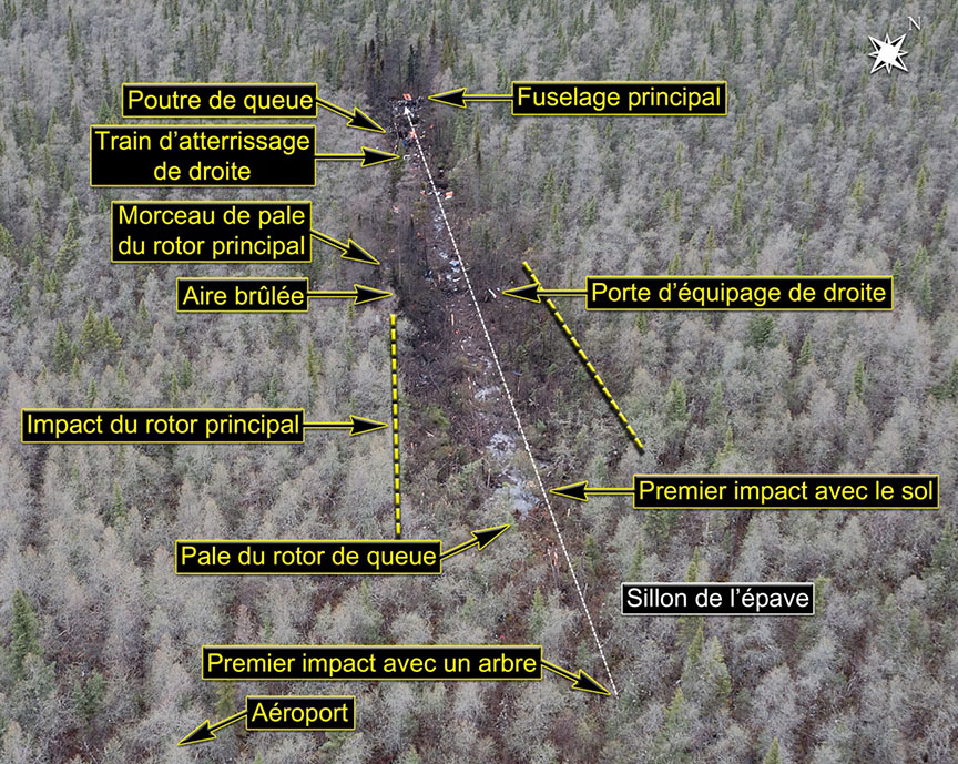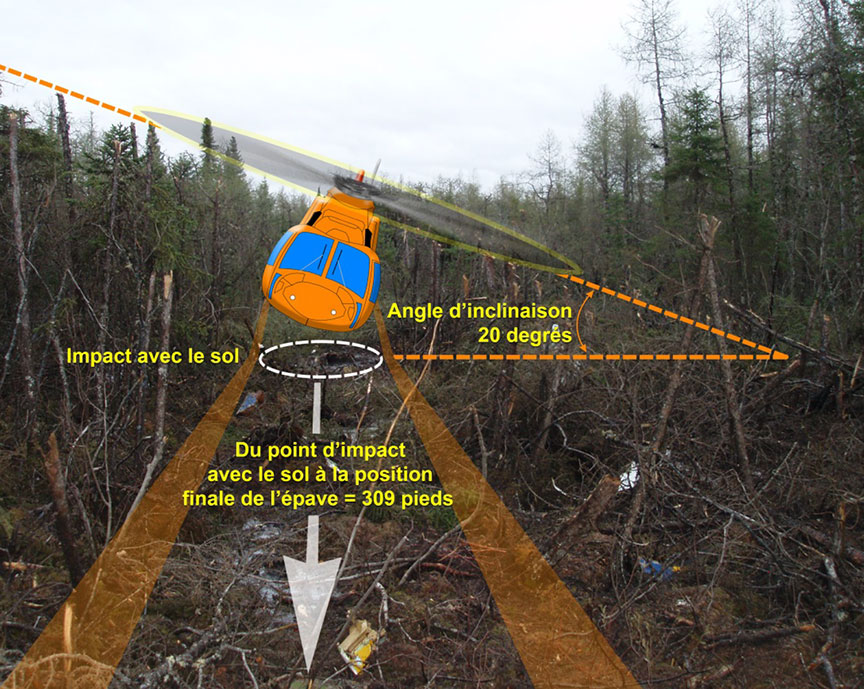 Environ 10 secondes plus tard, le premier officier a demandé la vérification après-décollage. Le capitaine a dit qu'ils franchissaient les 300 pieds au-dessus du sol (agl). Immédiatement après, le premier officier a informé le capitaine qu'il amorçait un virage à gauche. Le capitaine a accusé réception de l'annonce et a commencé la liste de vérification après décollage, en disant que le train était en mouvement, que le système de flottabilité de secours de l'aéronef était désamorcé et que les compas étaient asservis. Le capitaine a également offert au premier officier d'éteindre le phare d'atterrissage à sa place. Environ 5 secondes plus tard, le capitaine a répété qu'il allait éteindre le phare d'atterrissage; 2 secondes après, il a annoncé « inclinaison de 30 degrés ». Le premier officier a accusé réception de l'annonce, a indiqué que l'inclinaison était trop prononcée et s'est excusé. Une seconde plus tard, l'avertisseur de train d'atterrissage a retenti; le capitaine a signalé que l'hélicoptère descendait et a dit : « Montons ». L'aéronef a percuté le relief moins d'une seconde plus tard alors qu'il suivait un cap d'environ 318 ° magnétiques (M). Vingt-trois secondes se sont écoulées entre le moment où le premier officier a informé le capitaine qu'il amorçait le virage à gauche et le moment de l'impact.