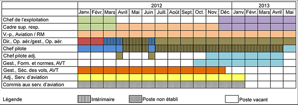 La première rotation de quarts du capitaine a eu lieu du 25 avril au 4 mai 2013. Tous les quarts étaient de jour (7 h à 19 h) et dans tous les cas, le capitaine était jumelé avec le premier officier en cause dans l'événement. Le capitaine a ensuite effectué une seconde rotation de quarts à compter du 23 mai 2013. Du 23 au 29 mai 2013, le capitaine a travaillé le quart de jour à CYMO. Le capitaine et le premier officier étaient jumelés du 23 au 27 mai 2013 pour des quarts de jour. Les 28 et 29 mai 2013, le capitaine a été jumelé avec un autre premier officier pour le quart de jour. Puis, le 30 mai 2013, les pilotes en cause dans l'événement devaient travailler ensemble pour un quart de nuit (19 h à 7 h). Il s'agissait de leur premier quart de nuit ensemble, et outre les 5 décollages et atterrissages de nuit réalisés durant l'entraînement sur simulateur à la fin de mars 2013, il s'agissait du premier vol de nuit du capitaine à Ornge RW. Au moment de l'événement, le capitaine avait effectué environ 28 heures de vol sur le S-76A depuis qu'il était entré au service d'Ornge RW en mars 2013.