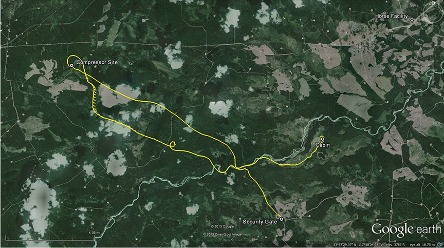 L'hélicoptère Robinson R44 Raven II (immatriculé C-GOCM, numéro de série 10472) était utilisé pour assurer la surveillance de chantiers de forage et d'autres installations au sud-ouest de Fox Creek (Alberta) pour une entreprise pétrolière locale. L'hélicoptère s'est rendu à plusieurs chantiers de forage jusqu'à 14 h 33Note de bas de page 1, puis est revenu à la base Horse Facility, d'où il est parti 3 minutes plus tard. À 14 h 50, après avoir fait un autre arrêt à un chantier de forage, l'hélicoptère a ensuite effectué un vol non autoriséNote de bas de page 2 jusqu'à une barrière de sécurité sur une route. Après 3 approches, l'hélicoptère s'est posé à 15 h 10. À 15 h 45, il fut observé que le pilote titubait et sentait l'alcool. Lorsqu'on lui a posé des questions, le pilote a fait des remarques désobligeantes. Le pilote et un passager non autorisé provenant de la barrière de sécurité sont ensuite montés à bord de l'hélicoptère. L'hélicoptère est parti à 15 h 54 vers une installation de compression, et s'y est posé 8 minutes plus tard. Le moteur de l'hélicoptère n'a pas été coupé pendant que le pilote effectuait son travail à l'installation. Il a quitté les lieux à 16 h 11, et a volé à basse altitude le long de la rivière Berland avant d'atterrir et de s'arrêter à un chalet isolé à 16 h 30. À 17 h 18, soit 48 minutes plus tard, l'hélicoptère a décollé et s'est rendu jusqu'à la barrière de sécurité, où il a effectué plusieurs passages et virages à basse altitude. L'aéronef a atterri devant la barrière à 17 h 31, et le passager est descendu 2 minutes plus tard. L'hélicoptère a décollé à 17 h 35, et l'on a observé qu'il volait de manière imprévisible pendant le départ. L'hélicoptère se disloque en vol au-dessus d'une zone boisée 5 minutes plus tard (Annexe A).