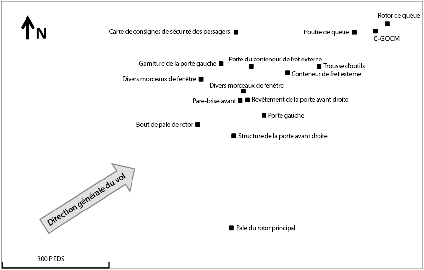 L'hélicoptère s'est disloqué en vol à une altitude d'environ 820 pieds au-dessus du sol (agl). La longueur totale de la traînée de débris laissée par l'épave (Annexe B - Traînée de débris de l'épave) est de 758 pieds, le premier élément étant l'une des pales de rotor (Photo 1).