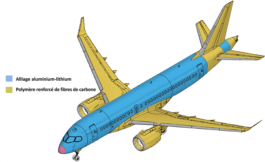 Le C Series est fabriqué à environ 70 % de matériaux de pointe : environ 46 % de matériaux composites (polymère renforcé de fibres de carbone), principalement dans les ailes, l'empennage et les fuseaux moteurs; et environ 24 % d'alliage d'aluminium-lithium, principalement dans le fuselage (figure 2).