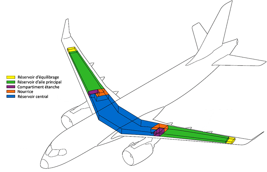 La structure du caisson central de l'aile et des ailes externes est constituée de longerons en caisson et abrite les réservoirs de carburant (figure 3). Les réservoirs principaux logés dans les ailes droite et gauche sont situés à l'extérieur des mâts réacteurs. Les compartiments étanches et les nourrices de gauche et de droite sont situés juste à l'intérieur des mâts réacteurs. Le réservoir central occupe le reste de la partie centrale de la voilure. Les ailes sont principalement fabriquées en polymère renforcé de fibres de carbone et comprennent les revêtements, lisses, longerons et semelles de longerons, ainsi que les nervures, qui sont en aluminium.