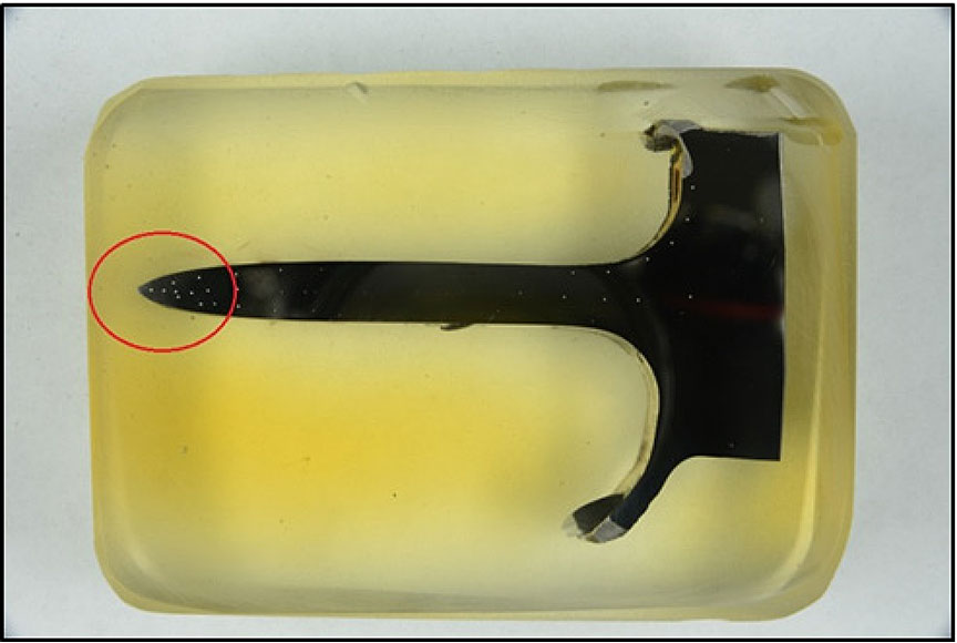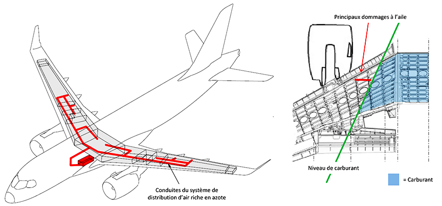 Le principal morceau de débris ayant pénétré dans le réservoir central l'a fait juste au-delà du niveau de carburant (figure 4), a traversé le volume mort et perforé le revêtement de l'extrados où il est resté coincé. L'absence de traces d'incendie à grande échelle prouve que le SIRC a fonctionné comme prévu pendant l'événement à l'étude.