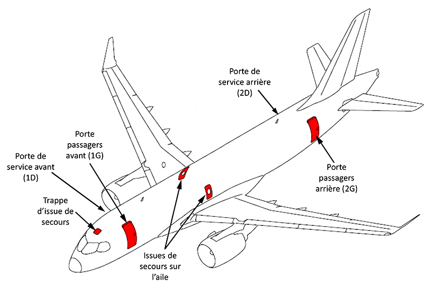 Les portes passagers et de service avant et arrière étaient toutes munies de glissières d'évacuation gonflables en état de fonctionnement. Les issues de secours sur l'aile, bien que pleinement opérationnelles, n'étaient pas équipées de glissières. Au moment de l'événement, seule la glissière de la porte arrière gauche était armée pour se déployer automatiquement dès l'ouverture de la porte. Lorsque la décision d'évacuation a été prise, l'équipage a armé la glissière de la porte avant droite (1D à la figure 5) et tous les occupants ont évacué l'aéronef par cette porte. Il n'existait aucune procédure écrite stipulant la configuration d'armement des glissières d'évacuation pendant des essais au sol des moteurs.