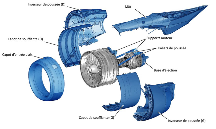 Les fuseaux moteurs sont fabriqués principalement en matériaux composites. Les capots d'entrée d'air, les buses d'éjection et les corps centraux de sortie des turbines sont montés directement sur les moteurs, alors que les capots de soufflante et les inverseurs de poussée sont montés sur les mâts réacteurs.