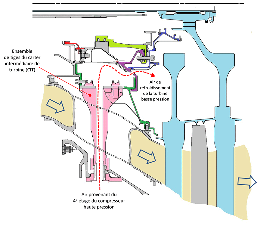 Le carter intermédiaire de turbine (CIT) est constitué d'enveloppes intérieure et extérieure jointes par 14 segments. Lorsque le gaz chaud sort de la THP, il passe entre ces segments vers la TBP (photo 1).