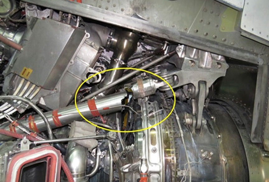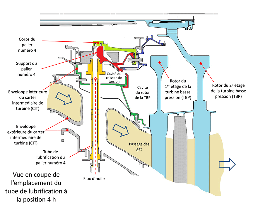Le tube de lubrification du palier no 4 monte de l'enveloppe extérieure du moteur (à une position d'environ 4 h en regardant vers l'avant), passe par un orifice aménagé dans l'enveloppe intérieure du CIT pour parvenir jusqu'au support de palier qui se trouve au cœur du moteur. Le diamètre de l'orifice est légèrement supérieur à celui du tube de lubrification. Par l'interstice dû à cette différence de diamètre, une certaine quantité d'air provenant du CIT pénètre dans le caisson de torsion. Par conséquent, cet air, qui est chaud en raison de sa proximité du passage des gaz de combustion, entre dans le caisson de torsion (figure 14).