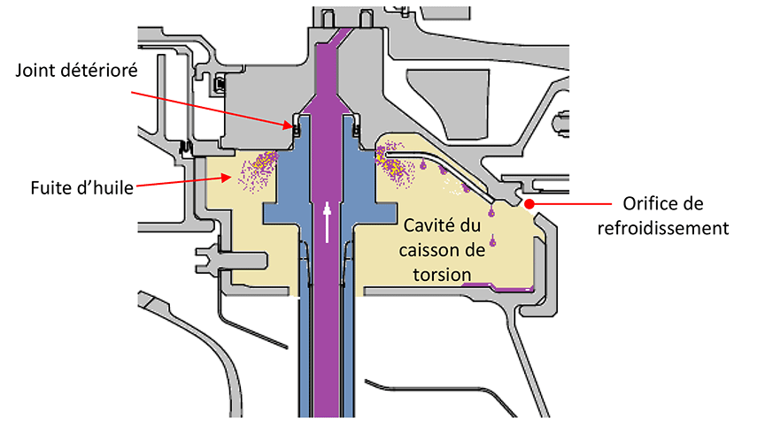 Alors que le moteur tournait au régime N1 de 74 %, de l'huile sous pression a commencé à fuir dans la cavité du caisson de torsion à partir de la surface de contact entre la bride du tube de lubrification du palier no 4 et l'ensemble CIT. À partir de ce point, l'huile s'est mêlée à l'air de refroidissement en circulation. L'air de refroidissement et l'huile ont traversé le caisson de torsion et, passant par les orifices de refroidissement à proximité, sont parvenus dans la cavité du rotor (figure 13).