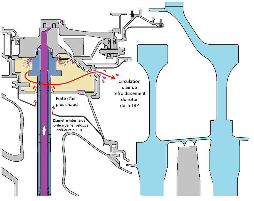 Le démontage n'a permis de déceler aucune des défaillances qui auraient pu provoquer une réduction de flux ou de pression dans le CIT et permettre aux gaz de combustion d'entrer dans la cavité du rotor. En outre, le scénario de panne par ingestion de gaz de combustion ne correspond pas aux circonstances de l'événement. En raison des champs de pression et de propagation, l'ingestion de gaz de combustion serait la plus forte à l'emplanture de pale. L'air chaud traverserait le 1er étage au niveau des emplantures de pales, puis gagnerait le rotor du 2e étage. Dans ce scénario, la zone qui subirait les plus grands dommages serait celle des attaches d'aubes des premier et deuxième disques. Les éléments du moteur en cause dans l'événement ne présentaient pas de dommages correspondant à ce scénario.