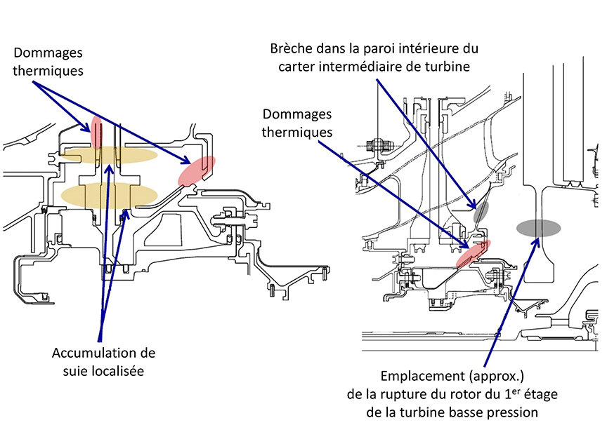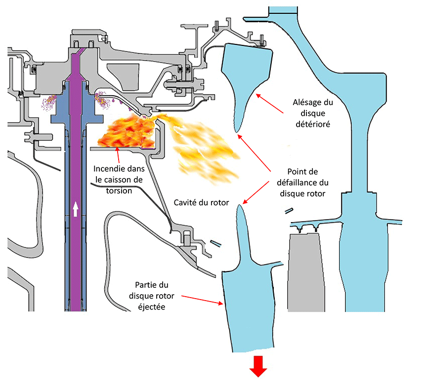- Ce mélange air-huile a ensuite été exposé à des températures ambiantes supérieures à son point d'allumage spontané, et la combustion subséquente a chauffé le rotor de la turbine basse pression jusqu'au point de défaillance.