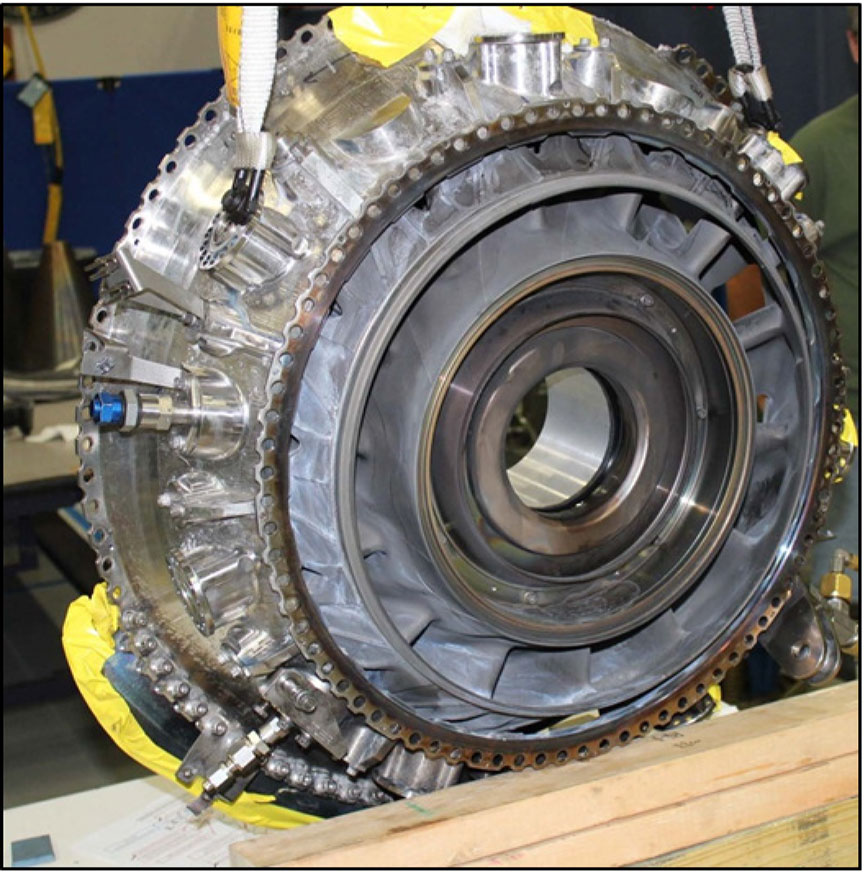 La température de l'air dans le caisson de torsion se situait sous le point d'allumage spontané de l'huile pendant les 15 minutes et 8 secondes passées au régime N1 à 60 %. Lorsque le régime N1 a atteint 74 %, la température de l'air de refroidissement dans le caisson de torsion s'est accrue, ce qui est normal et prévu dans la conception, en raison de l'exposition à la chaleur accrue des gaz circulant vers le bas et autour des tiges du CIT (figure 14). Lorsque la température dans le caisson de torsion a dépassé son point d'allumage spontané, l'huile y a pris feu. L'incendie qui en a résulté, alimenté en continu, s'est propagé jusque dans la cavité du rotor, entraîné à travers les orifices les plus proches du support de palier par la circulation de l'air de refroidissement. L'incendie a ensuite atteint la face avant du disque rotor, surchauffant l'âme du disque jusqu'à ce que la force centrifuge cause une défaillance par surcharge en traction (figure 15).