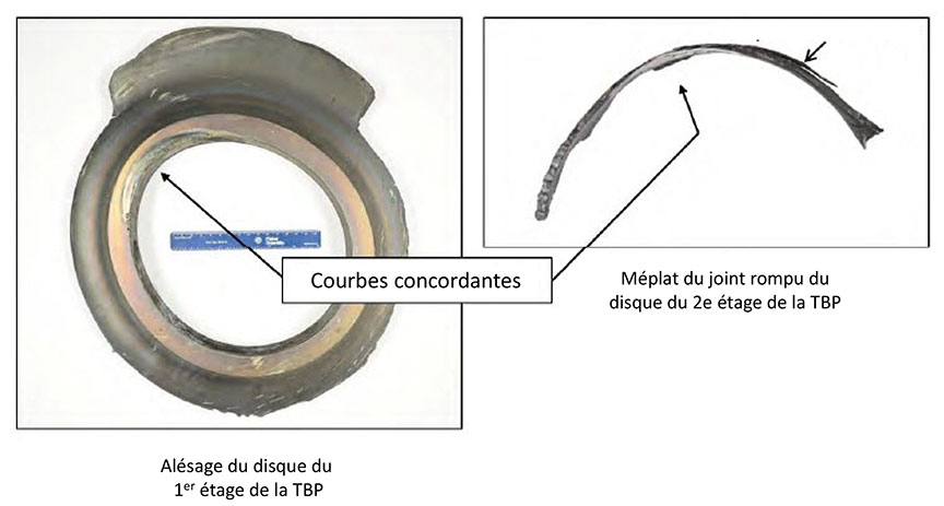On a également étudié la possibilité qu'il y ait eu production d'étincelles par frottement ou allumage au contact d'une surface chaude. Cependant, aucun signe de frottement n'a été relevé, et l'analyse du phénomène d'allumage au contact d'une surface chaude a permis de conclure qu'il était ici extrêmement improbable. Par conséquent, la conclusion d'un allumage spontané du mélange air-huile a été retenue. L'emplacement et la gravité des dommages thermiques qui ont été constatés sur la paroi arrière du CIT du côté de la cavité du rotor indiquent une combustion intense entre la paroi arrière du CIT et le disque rotor du 1er étage de la turbine basse pression 1 (TBP1). Le feu d'huile sur la face avant de la TBP1 a eu pour effet d'exposer le disque rotor à des températures surélevées, causant un ramollissement du matériau du disque, jusqu'à son point de défaillance par surcharge en traction. Cela a été confirmé par l'analyse en laboratoire de débris récupérés du rotor.