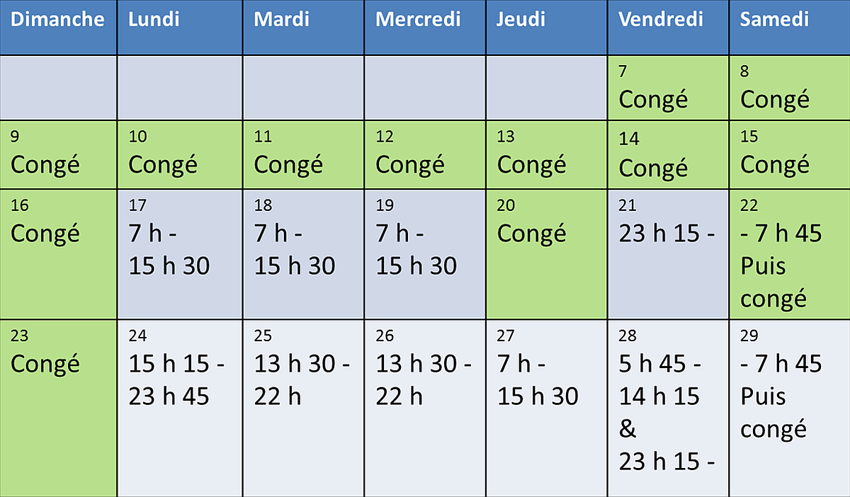 Le contrôleur de la tour détenait une licence et avait les qualifications requises par la réglementation au moment de l’événement. Le contrôleur cumulait 5,5 années d’expérience du contrôle de la circulation aérienne, dont 2 à la tour de contrôle de Calgary. Le tableau 1 donne un aperçu de l’horaire de travail du contrôleur pour les 3 semaines précédant l’événement. Le jour de l’événement était le dernier de 6 jours de travail consécutifs. Au cours des 3 derniers jours, il avait commencé des débuts de quart devancés de plus en plus tôt chaque jour. À la date de l’événement, le contrôleur avait travaillé de jour jusqu’à 14 h 13, puis était revenu au travail le même jour à 23 h 15 pour prendre son service de nuit à 23 h 45. Bien que le BST ait conclu précédemment qu’il y a un risque de fatigue au cours des quarts de nuit avec ce type de rotation des quartsNote de bas de page 14, la fatigue n’est pas considérée comme un facteur contributif à cet événement.