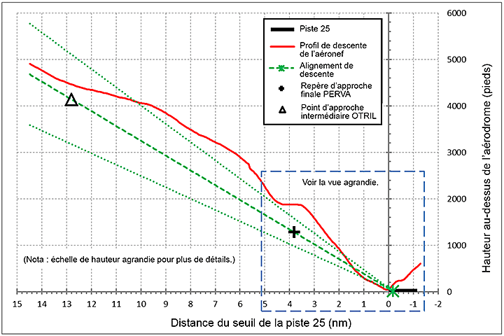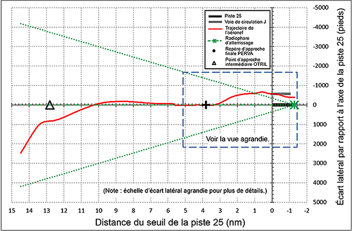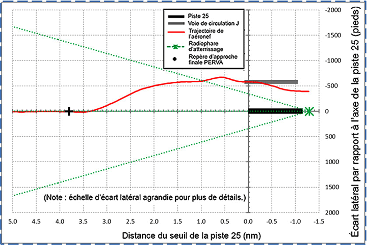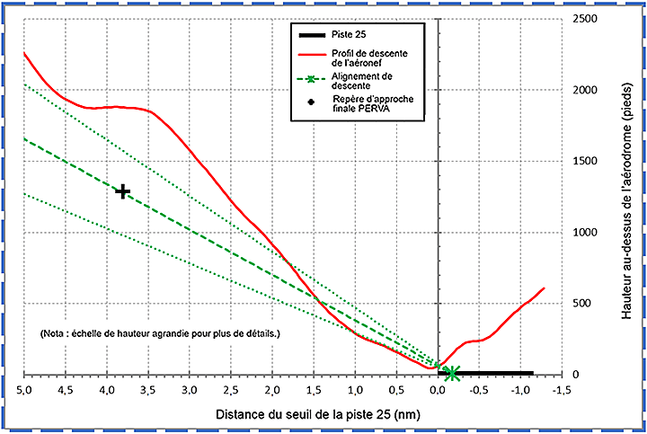 Tout juste avant le franchissement du repère d'approche finale, le pilote automatique a mis l'aéronef en palier à une altitude de 3000 pieds au-dessus du niveau de la mer, ce que n'avait pas prévu l'équipage de conduite. À ce moment, le PC a établi un contact visuel avec ce qu'il croyait être la piste, et il a sélectionné le mode de pilotage transparent pour manœuvrer l'aéronef vers la piste présumée. Rendu à 1000 pieds agl et moins, l'approche n'était pas stabilisée et l'équipage de conduite n'a jamais déterminé qu'il devait amorcer une remise des gaz. L'aéronef se trouvait initialement au-dessus de l'alignement de descente et il a poursuivi sa descente sous les 1000 pieds agl en affichant un taux de descente élevé. L'aéronef était aligné sur la voie de circulation J, qui était 2 fois moins large que la piste, ce qui a donné à l'équipage de conduite l'impression que l'approche se faisait à une altitude élevée. En l'absence de références supplémentaires, l'équipage de conduite a poursuivi sa route sous l'alignement de descente afin de tenter de retrouver la scène visuelle attendue.