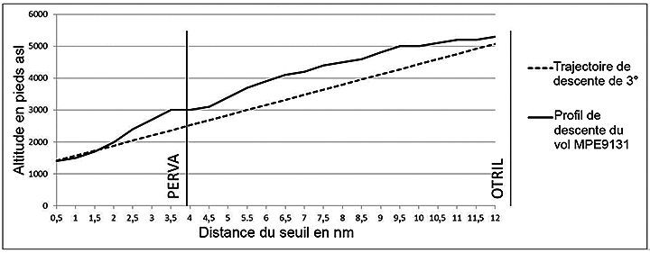 Alors qu'il approchait les 3000 pieds asl à une vitesse indiquée de 140 nœuds, le vol MPE9131 se trouvait à 2,5 points au-dessus de l'alignement de descente, comme indiqué par la barre d'alignement de descente. L'équipage a embrayé le pilote automatique, configuré le panneau de commande de modeNote de bas de page 5 en mode d'acquisition d'altitude et réglé l'altitude à 3000 pieds. Le pilote automatique a enclenché le mode d'approche après avoir capturé l'alignement de piste et réglé l'automanette en mode vitesse sur le panneau de commande de mode. À 18 h 36 min 28 s, compte tenu des réglages du pilote automatique, le vol MPE9131 s'est mis en palier à 3000 pieds asl juste avant d'atteindre le repère d'approche finale PERVA, ce qui n'avait pas été prévu par l'équipage de conduite. L'automanette a augmenté la poussée pour maintenir la vitesse sélectionnée (annexe B).
