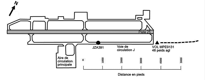 À 18 h 38 min 21 s, lorsqu'il est devenu manifeste, pour l'équipage du vol MPE9131, que l'aéronef était aligné sur la voie de circulation J, il a procédé à une remise des gaz alors que l'aéronef était à 46 pieds agl (figure 2). Deux secondes plus tard, l'aéronef s'est trouvé par le travers du seuil de la piste 25, à 2800 pieds du vol JZA391. Lorsque le vol MPE9131 a survolé le vol JZA391, il se trouvait à 230 pieds au-dessus de ce dernier, et continuait de monter.