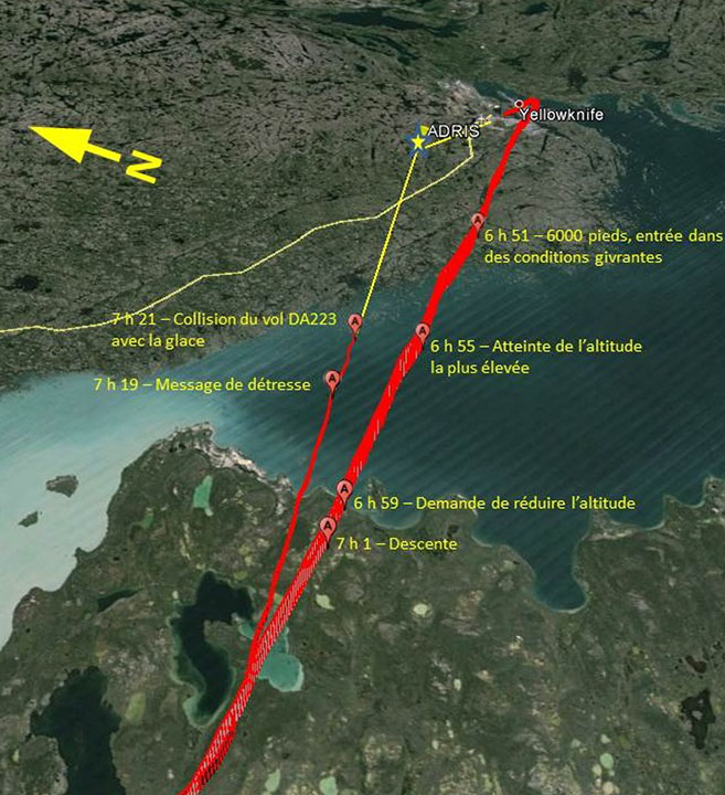 À 7 h 16, le CCR d'Edmonton a confié le contrôle du vol DA223 à la tour de contrôle de la circulation aérienne (ATC) de Yellowknife. À 7 h 17, le pilote a informé la tour de Yellowknife que l'aéronef se trouvait dans des conditions de givrage fort et qu'il était incapable de maintenir son altitude. Le vol DA223 a reçu l'autorisation de descendre à 2100 pieds asl (altitude minimale de guidage). À 7 h 19, le pilote a ressenti un fort mouvement de tangage intempestif vers l'avant et a informé l'ATC que le vol DA223 ne pouvait pas maintenir l'altitude de 2100 pieds asl; il a lancé un appel Mayday.
