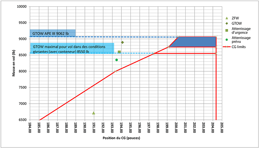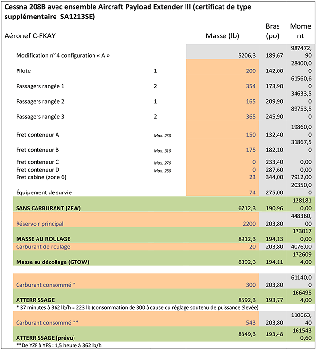 La masse maximale certifiée au décollage du Cessna 208B est de 8750 livres. Air Tindi exploitait C-FKAY avec le conteneur de fret Aircraft Payload Extender III (APE III) fabriqué par AeroAcoustics Aircraft Systems Inc., installé conformément au certificat de type supplémentaire (CTS) SA01213SE. Ce conteneur portait à 9062 livres la masse maximale au décollage, et à 9000 livres la masse maximale à l'atterrissage. Les limites avant du centre de gravité (CG) étaient les mêmes, sauf pour un prolongement, de 199,15 pouces pour 8750 livres, à 200,23 pouces pour 9062 livres. La limite arrière du CG demeurait la même. La masse maximale pour un vol dans des conditions givrantes connues avec le conteneur de fret installé était la même, soit 8550 livres. Le pilote n'a pas observé la restriction de masse et de centrage dans des conditions givrantes lorsqu'il a chargé l'aéronef.
