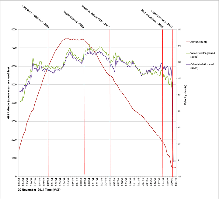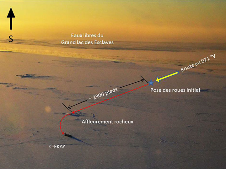 Les effets de l'accumulation de givre étaient tels que le pilote n'a pu réduire le taux de descente, se soldant en un atterrissage forcé sur la surface du Grand lac des Esclaves et à la collision avec le relief.