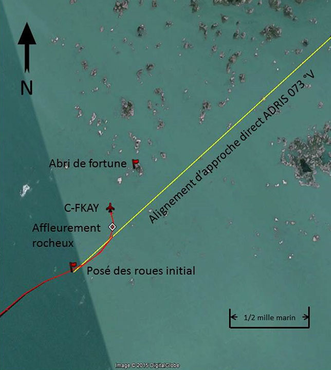 Toujours dans la noirceur, le vol DA223 a heurté la surface glacée du Grand lac des Esclaves à 7 h 21, et l'aéronef a poursuivi sa course sur 2300 pieds avant que le nez et le train principal gauche percutent un affleurement rocheux. L'aéronef s'est immobilisé à environ 600 pieds de l'affleurement rocheux et à environ 2900 pieds du point de posé initial (figure 1). Aucun des occupants n'a été blessé, mais l'aéronef a été lourdement endommagé. Aucun incendie ne s'est déclaré après l'impact.