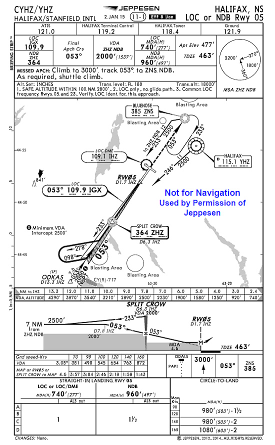 Pendant le vol de croisière, l'équipage de conduite a calculé les facteurs de correction en raison du temps froid pour l'altitude de franchissement du repère d'approche finale (FAF) Split Crow, l'altitude minimale de descente (MDA), et l'altitude d'approche interrompue. Il a déterminé que l'altitude de franchissement du FAF serait de 2200 pieds au-dessus du niveau de la mer (ASL), selon l'altitude publiée de 2000 pieds plus une correction de 200 pieds en raison du temps froid. L'équipage de conduite a calculé une MDA de 813 pieds ASL, selon la MDA publiée de 740 pieds ASL plus une correction en raison du temps froid de 23 pieds, plus 50 pieds ajoutés à la MDA corrigée, comme l'exige le manuel d'exploitation de vol (MEV) d'Air CanadaNote de bas de page 6. L'équipage de conduite a calculé un angle de trajectoire de vol en fonction de la FAF corrigée en raison du temps froid. Le calcul se fondait sur l'angle de descente verticale publié de −3,08° indiqué sur la carte d'approche JeppesenNote de bas de page 7 (annexe A) et dans le manuel de référence rapide Airbus A320 Quick Reference Handbook d'Air CanadaNote de bas de page 8, pour un angle de trajectoire de vol final calculé de −3.5°.